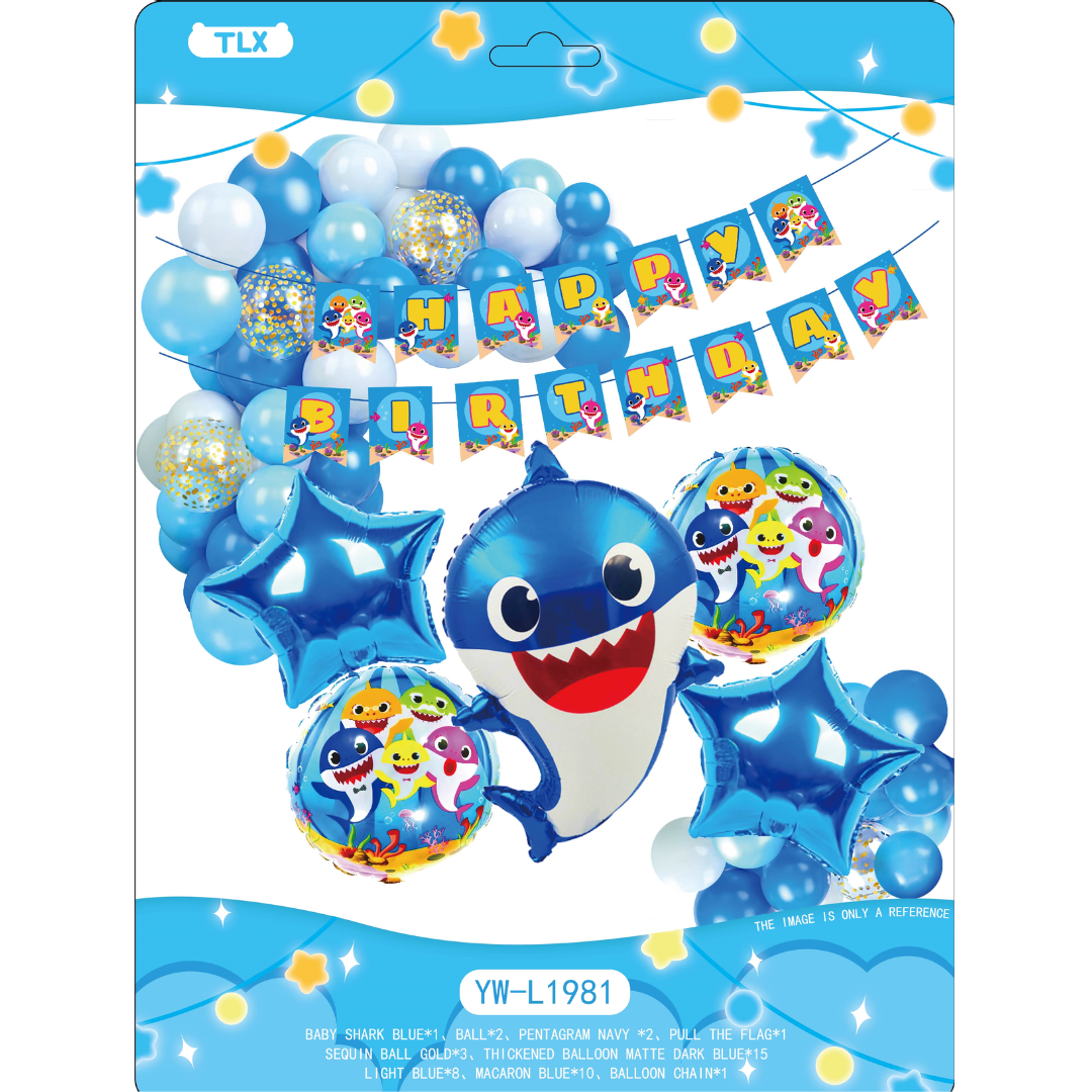 Set aniversar Baby Shark albastru cu 43 piese, ideal pentru decorarea unei petreceri pentru copii. Include arcadă de baloane, bannere HAPPY BIRTHDAY și baloane folie tematice.