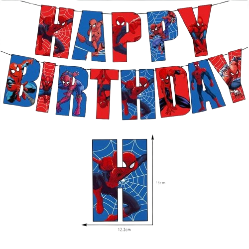 Transforma petrecerea copilului intr-o aventura spectaculoasa cu bannerul Happy Birthday inspirat din universul Spiderman! Fiecare litera este imprimata cu imagini dinamice ale supereroului, in culori intense rosu-albastru, aducand energie si atmosfera de sarbatoare.
