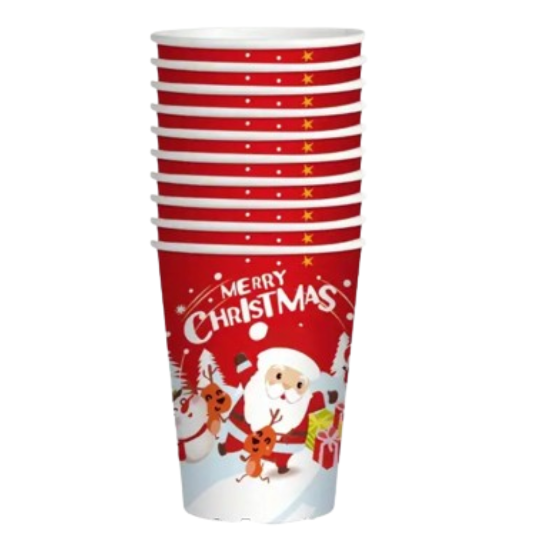 Pahare festive din carton, decorate cu un design vesel de Crăciun: Moș Crăciun, căsuțe de iarnă, oameni de zăpadă și cadouri colorate, pe fundal roșu. Sunt ideale pentru petreceri de sezon, serbări, evenimente tematice sau mesele festive din familie.
