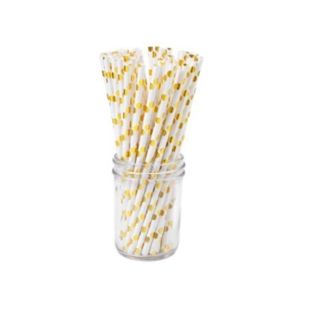 Adauga un plus de stil si eleganta bauturilor de la petrecere cu acest set de paie din hartie, decorate cu buline aurii metalizate. Perfecte pentru aniversari, baby shower, nunta sau petreceri tematice gold.
