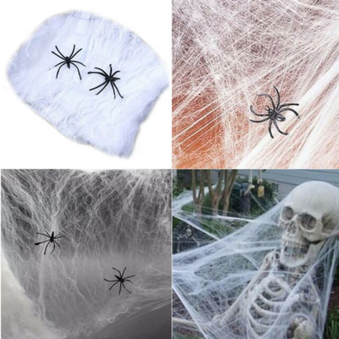 Această pânză realistă, fabricată din fibre sintetice fine și elastice, se întinde ușor și acoperă o suprafață mare, oferind un efect autentic de „casă bântuită”. În pachet sunt incluși doi păianjeni decorativi, realizați din plastic ușor, cu detalii care imită perfect textura și culoarea reală.