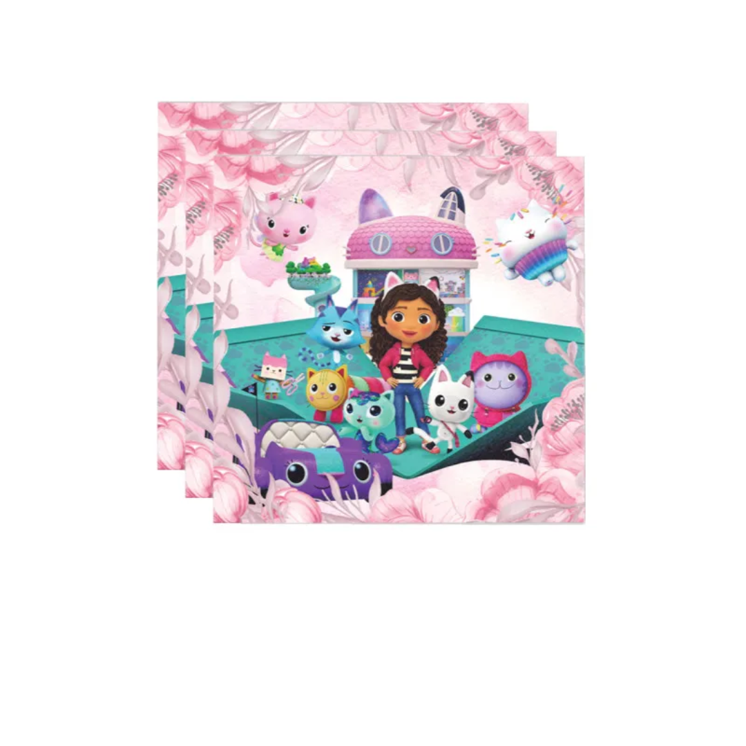 Set de șervețele din hârtie, decorate cu Gabby și prietenii ei pisicuțe din îndrăgitul serial animat Gabby’s Dollhouse. Designul delicat, cu elemente roz și pastel, este ideal pentru petreceri aniversare dedicate fetițelor.