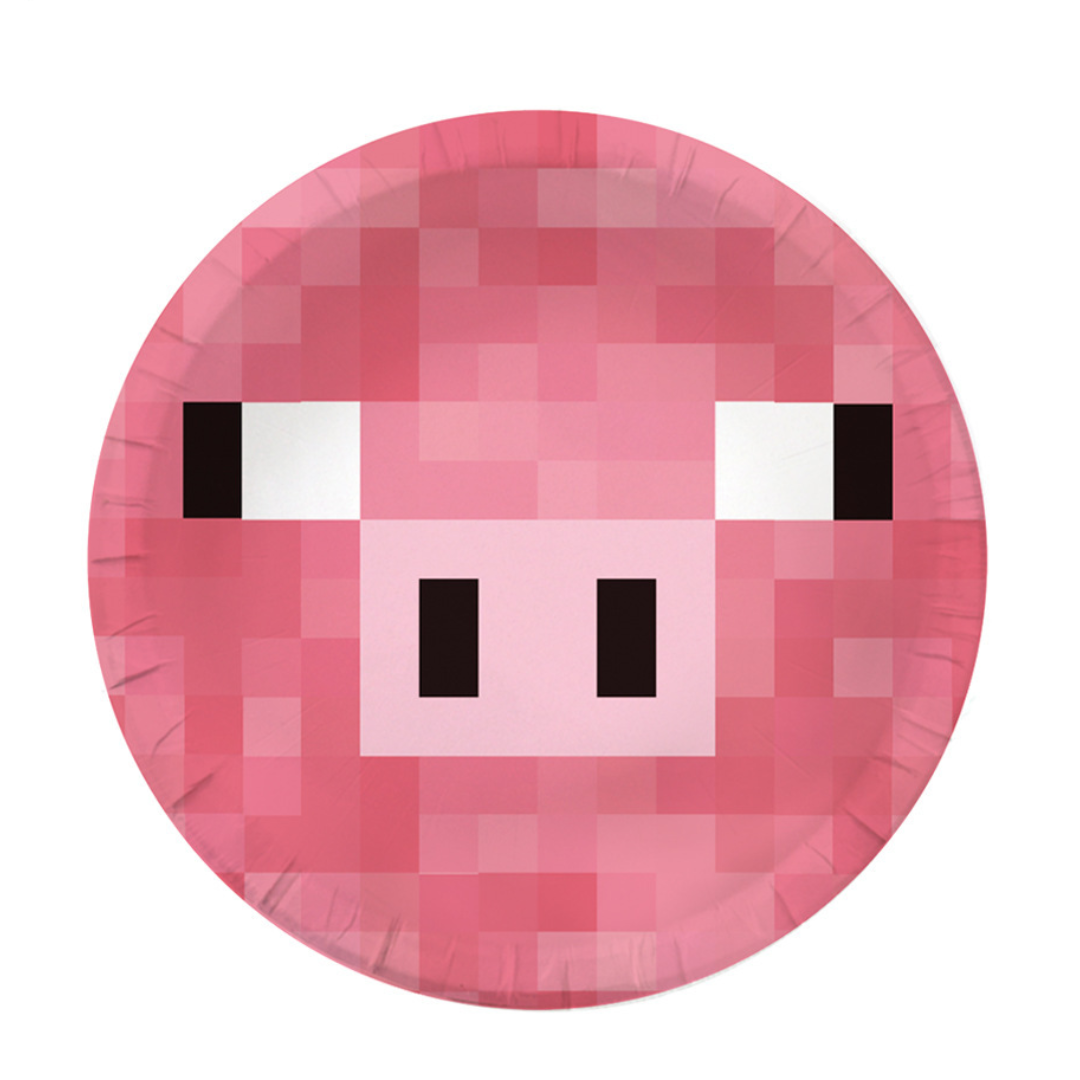 Set de farfurii din carton, decorate cu porcul din jocul Minecraft, un personaj ușor de recunoscut și îndrăgit de copii. Ideale pentru petreceri aniversare și evenimente tematice cu tematică gaming.